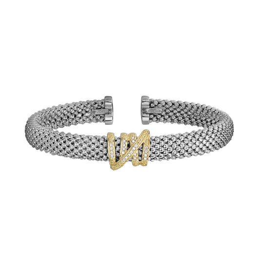 Two Tone 18K Gold or Sterling Silver Popcorn Textured Cuff Bangle with Coil Center Element and Diamonds
