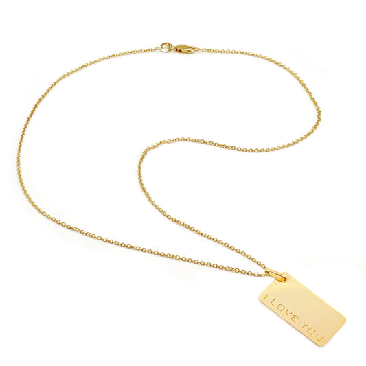 I Love You Dog Tag Pendant in High Polished 14K Gold | Punched Out Block Text