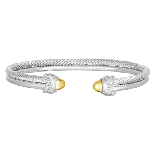 18K Gold & Sterling Silver Textured Double Strand Italian Cable Cuff Bangle with White Diamond