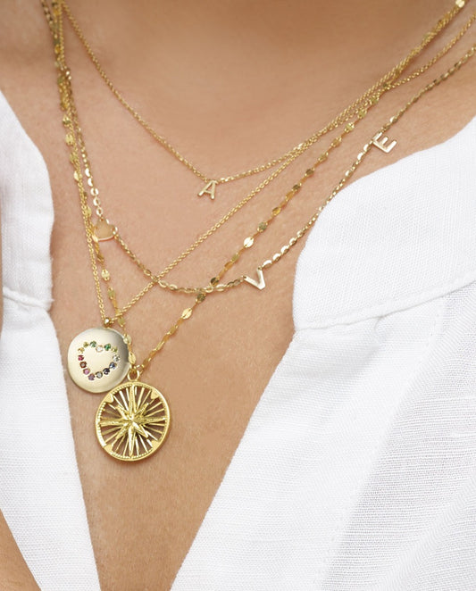 14K Gold and Gemstone Inlay Rainbow Heart Disc Medallion Necklace