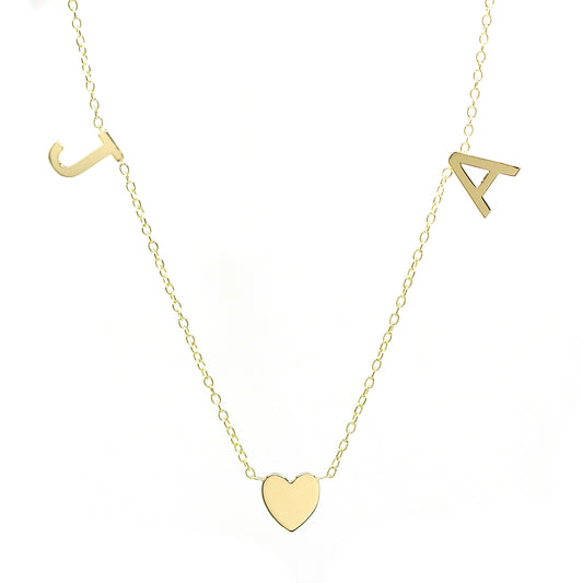 Personalized 2 Initial Necklace with Heart Charm in Solid 14K Gold
