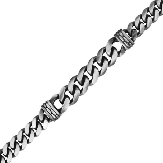 Men's Sterling Silver Gunmetal Miami Cuban Fleur de Li Station Bracelet with Lobster Clasp