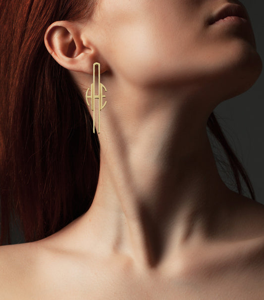 Elongated Monogram Drop Earrings in High Polished 14K Gold