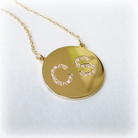 14K Gold Disc and Diamond Pendant Necklace | Customizable 2 Initial Monogram
