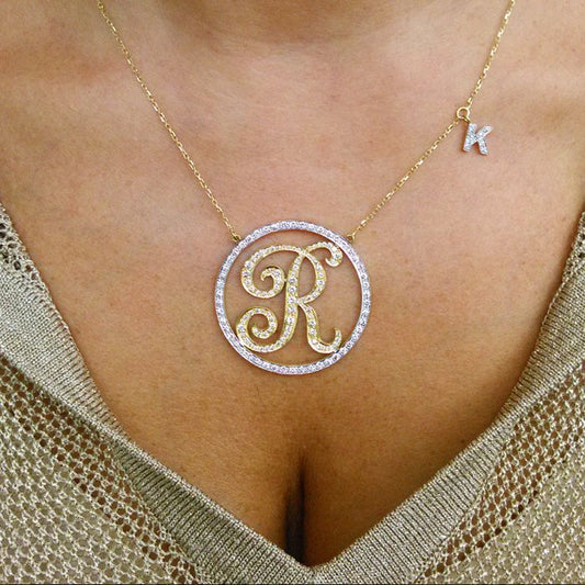 14K Gold and Diamond Monogram Halo Pendant with Secondary Letter on Chain
