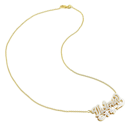 14K Gold Double Name Plate with Diamonds and Rhodium Sparkle