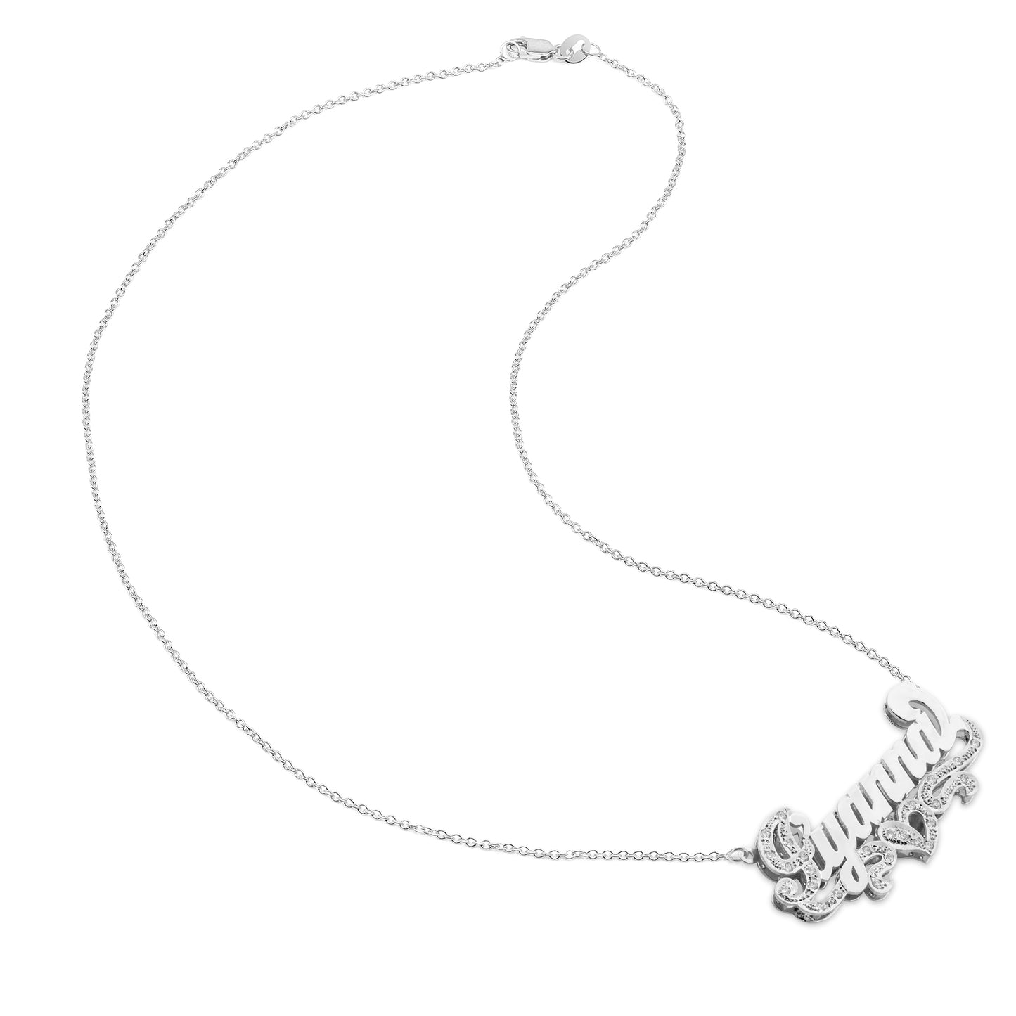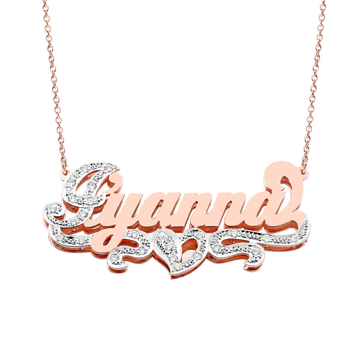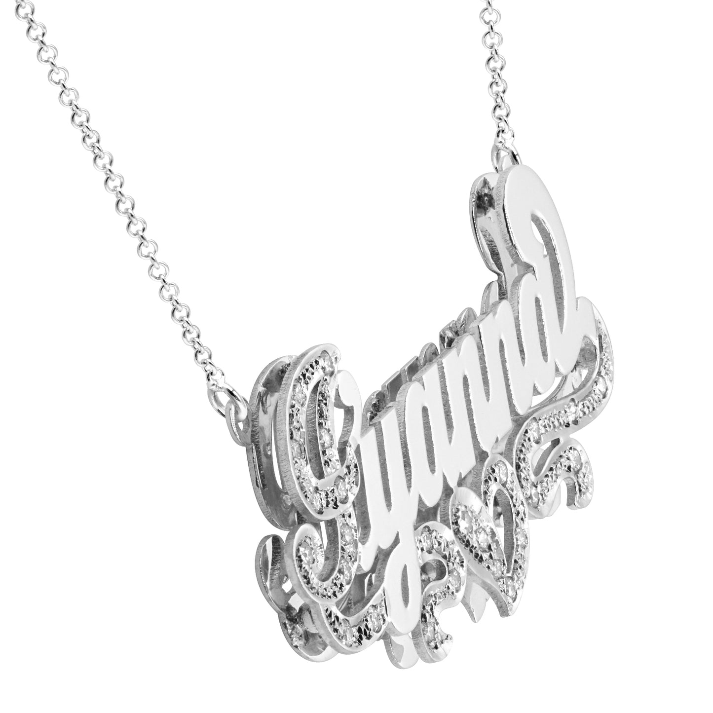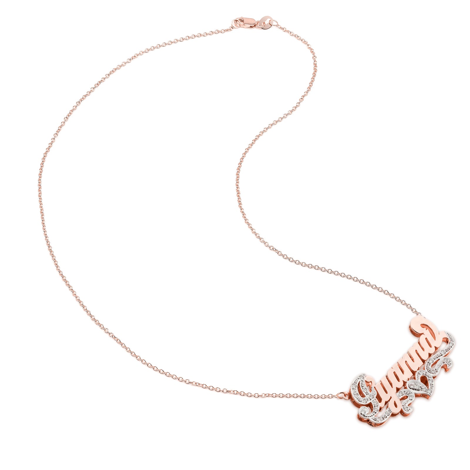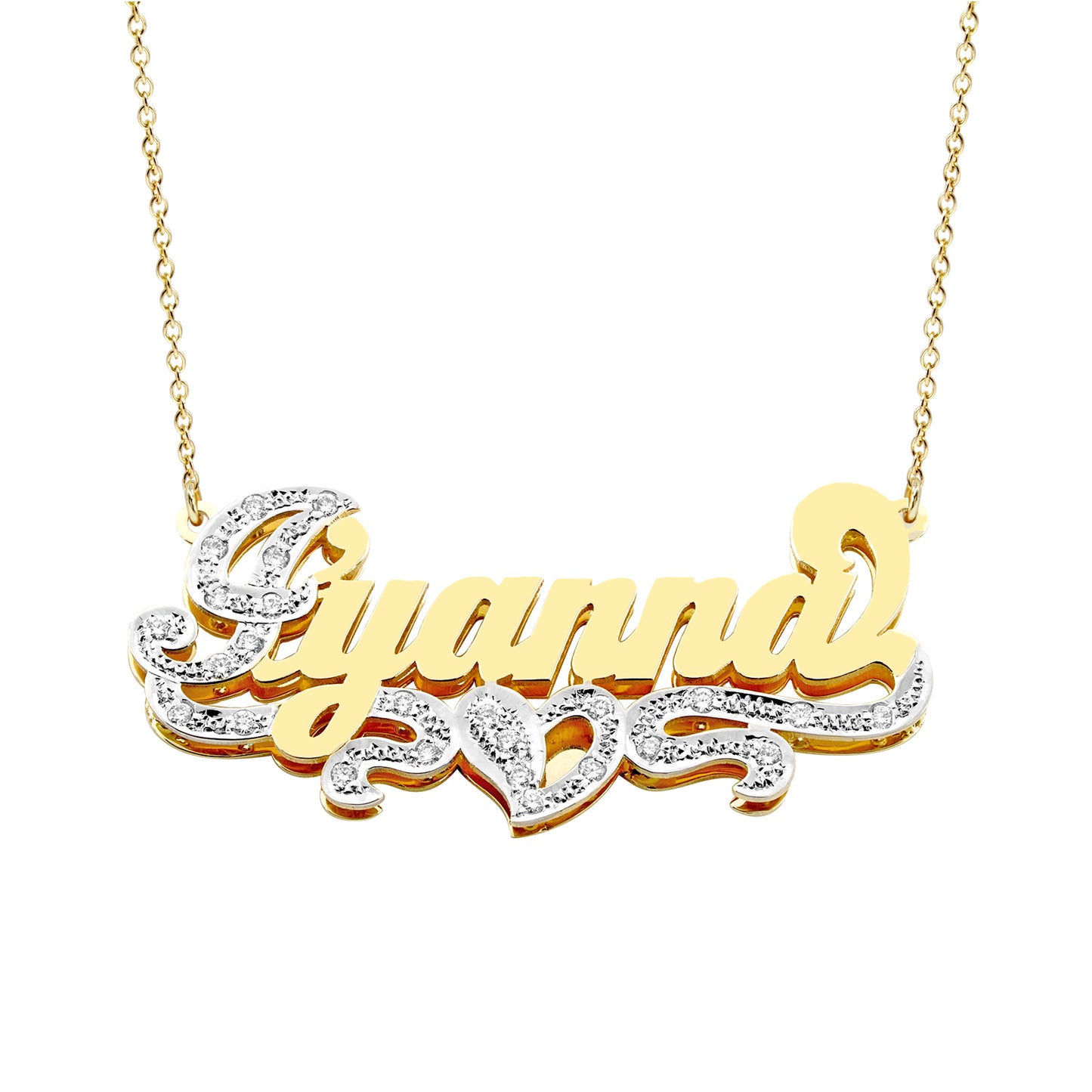 14K Gold Double Name Plate with Diamonds and Rhodium Sparkle