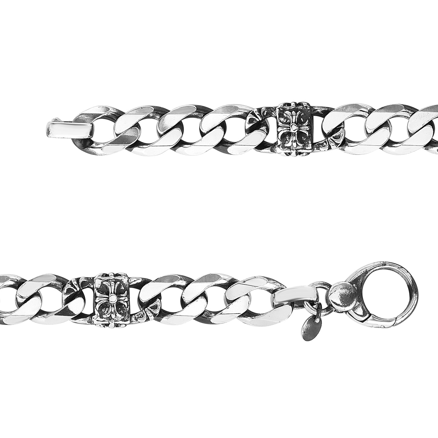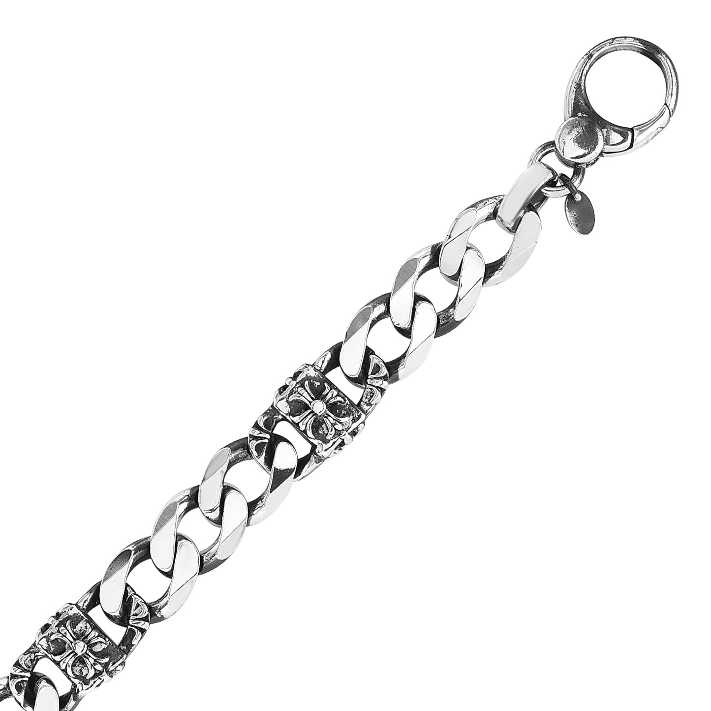 Men's Sterling Silver Gunmetal Miami Cuban Fleur de Li Station Bracelet with Lobster Clasp