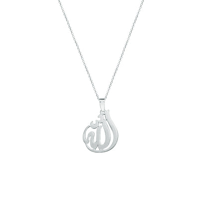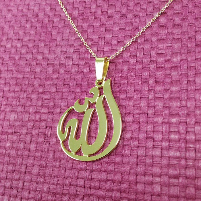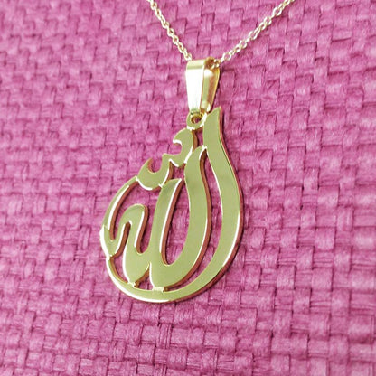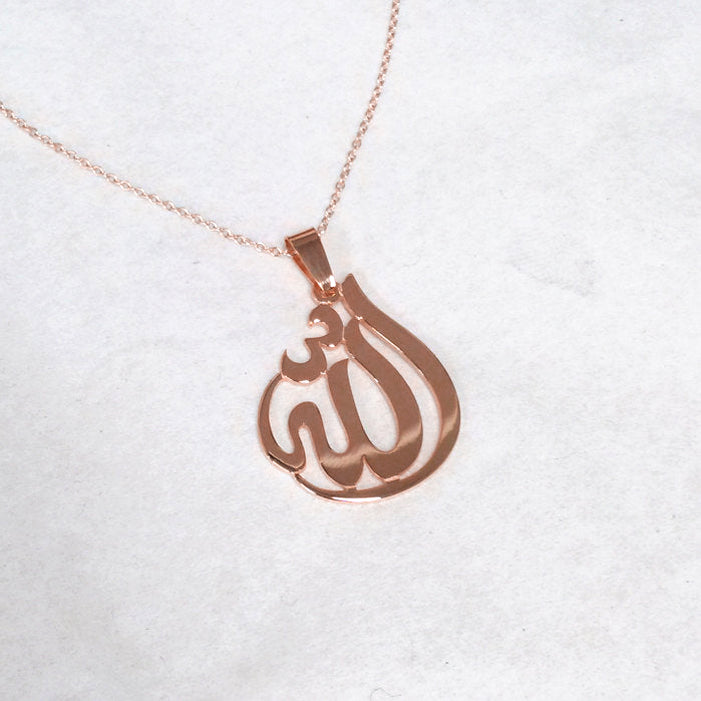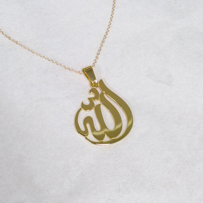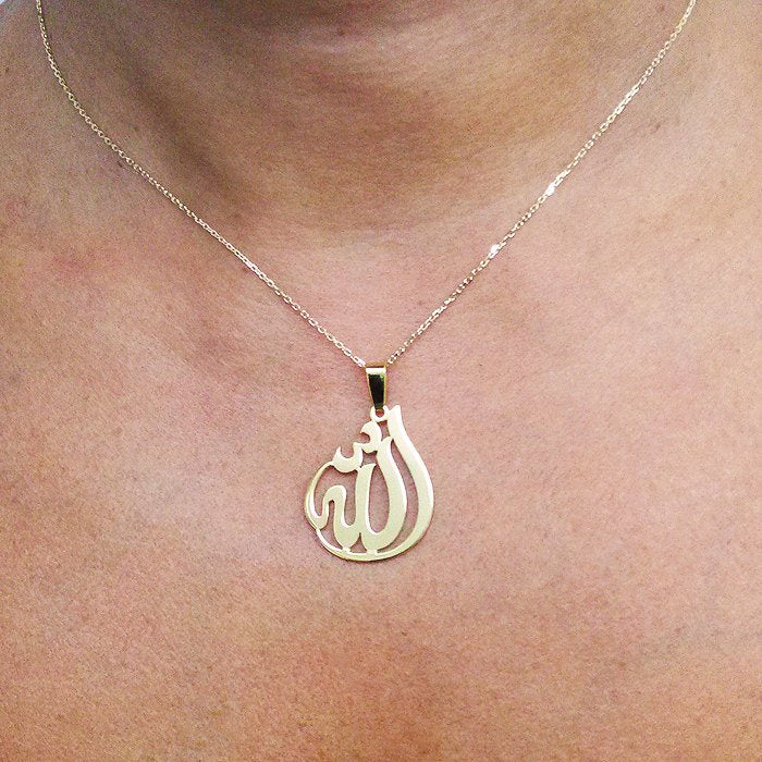 14k Gold Allah Necklace, 0.875 x 1.1 inch in and about 1.0 mm thick, with a Choice of Yellow Gold, Pink Gold or White Gold. Pendant suspends from a cable Link chain with 4 choices of length: 14",16", 18" or 20" Chain.