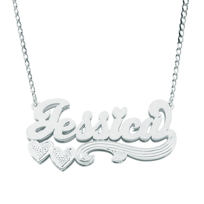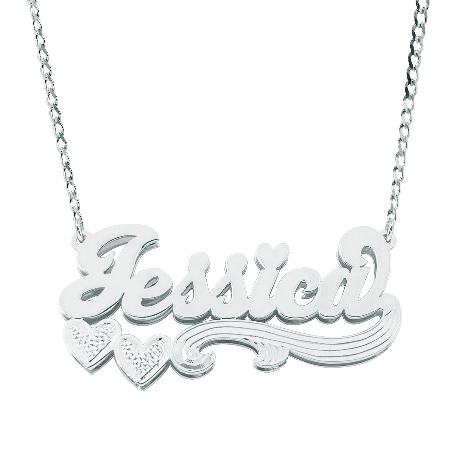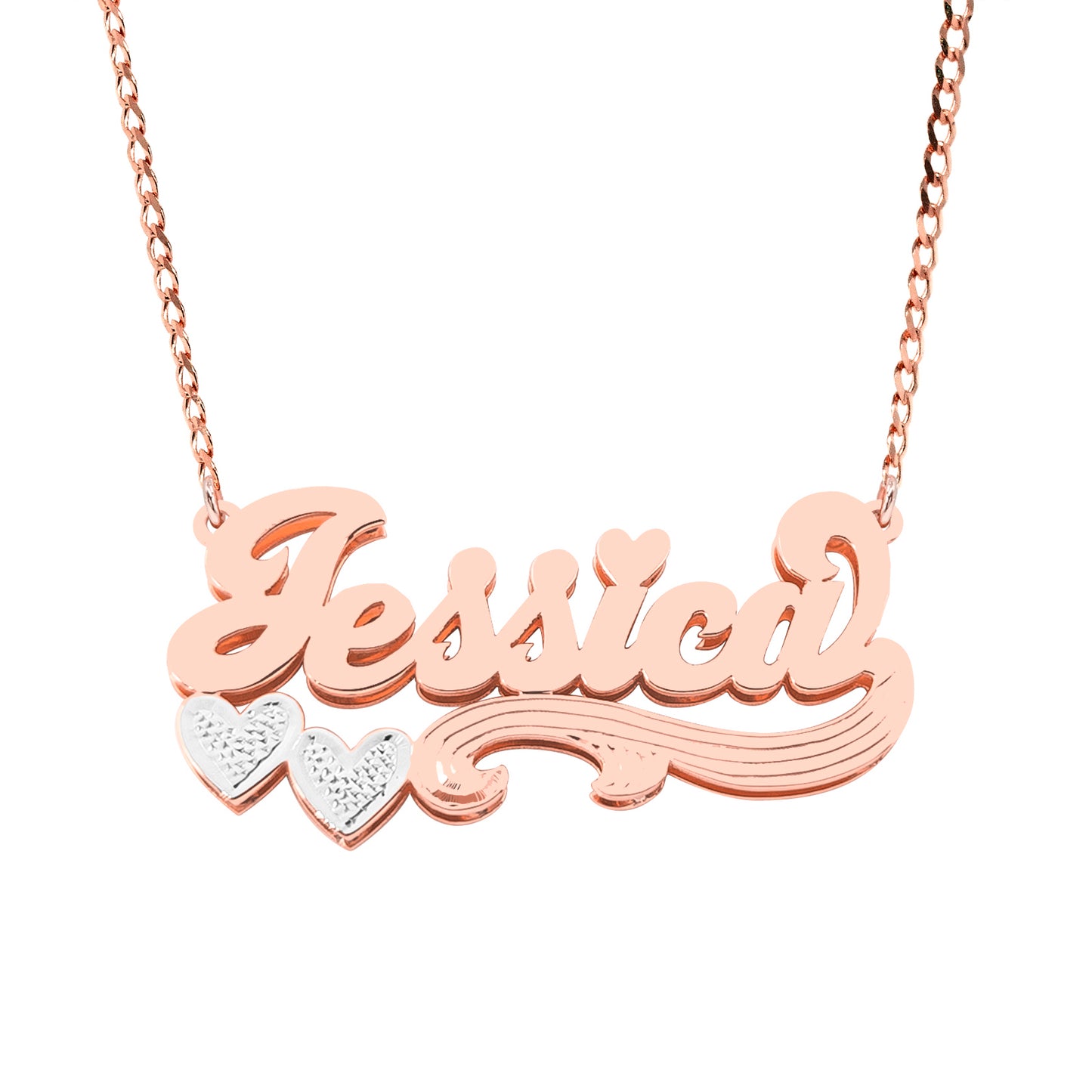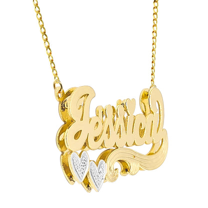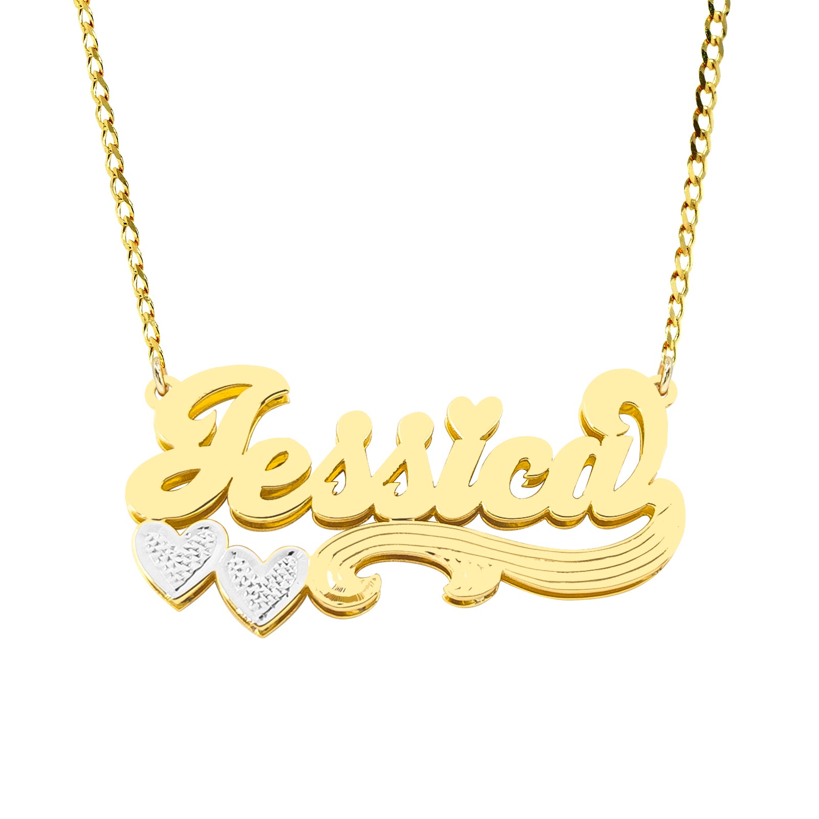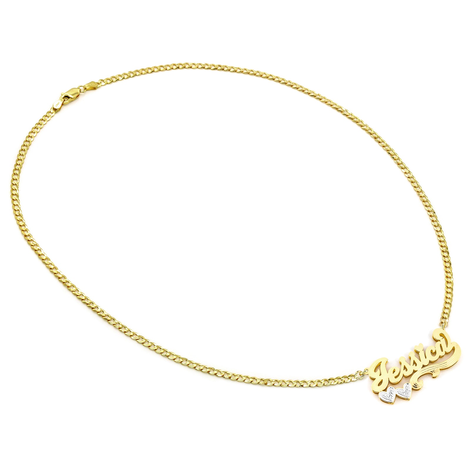 Double Heart Nameplate Curb Chain Name Necklace in 14k Gold with Rhodium Sparkle