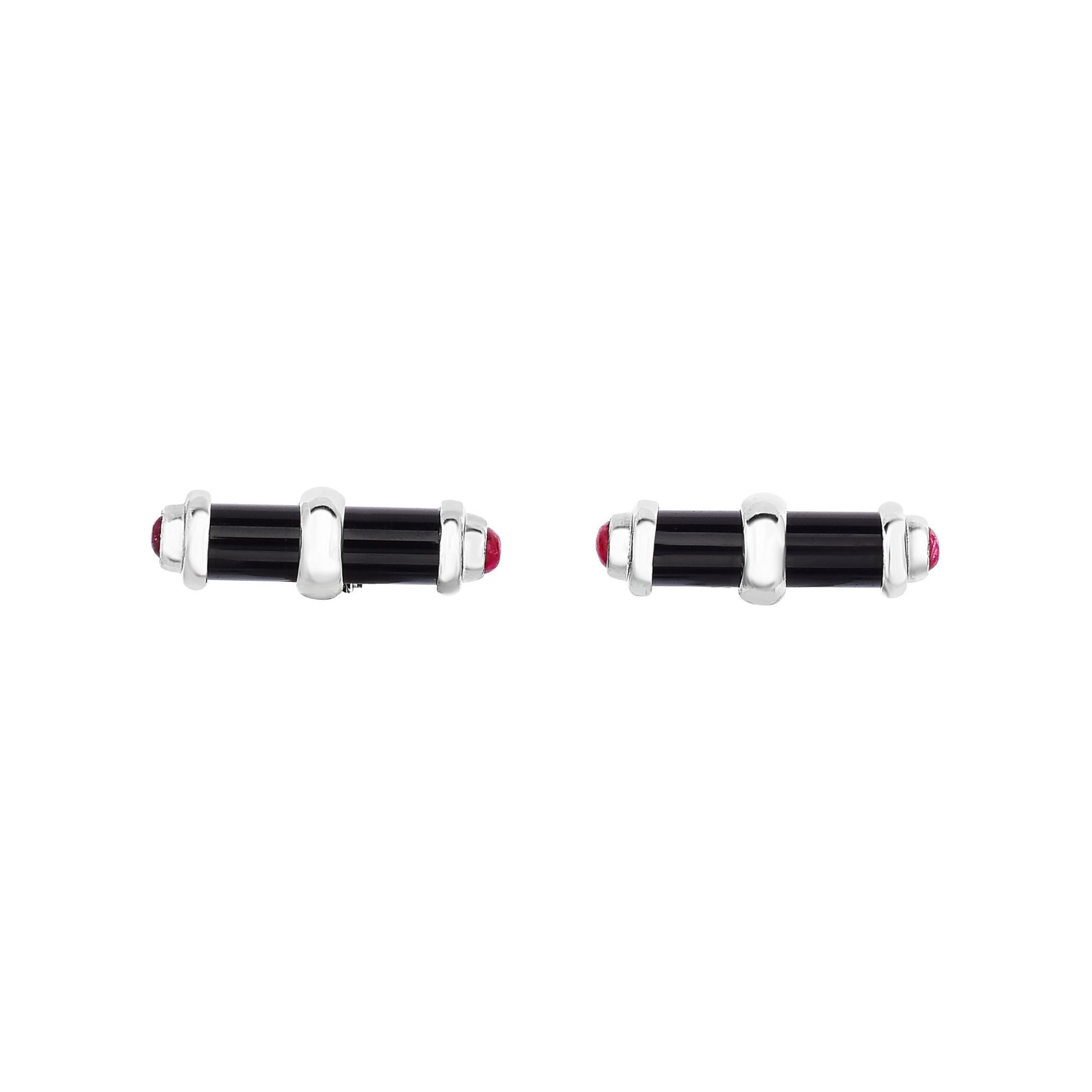 Sterling Silver Cylinder Shape Cufflinks with Black Onyx and Ruby tips. Rhodium finish, long