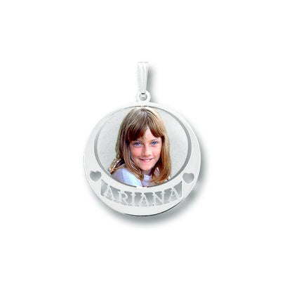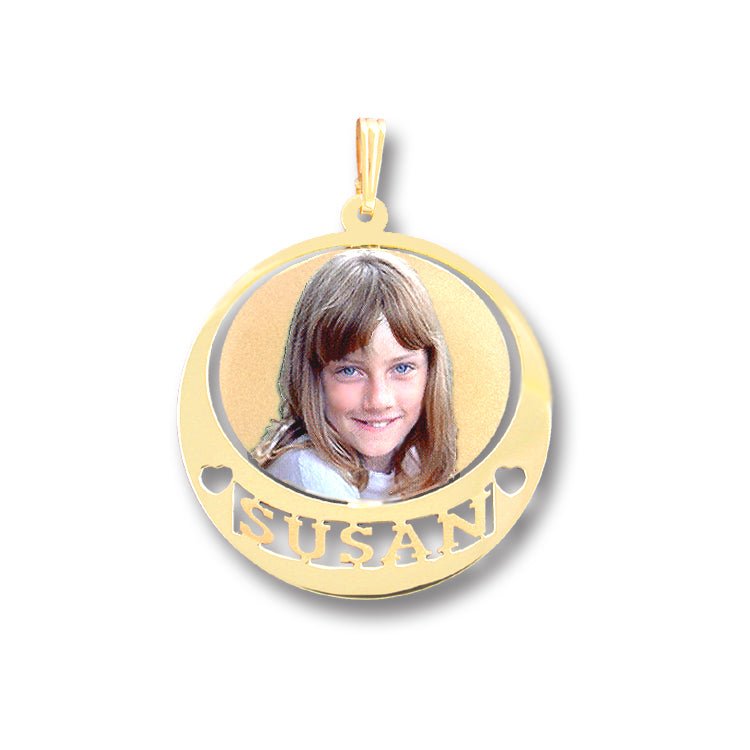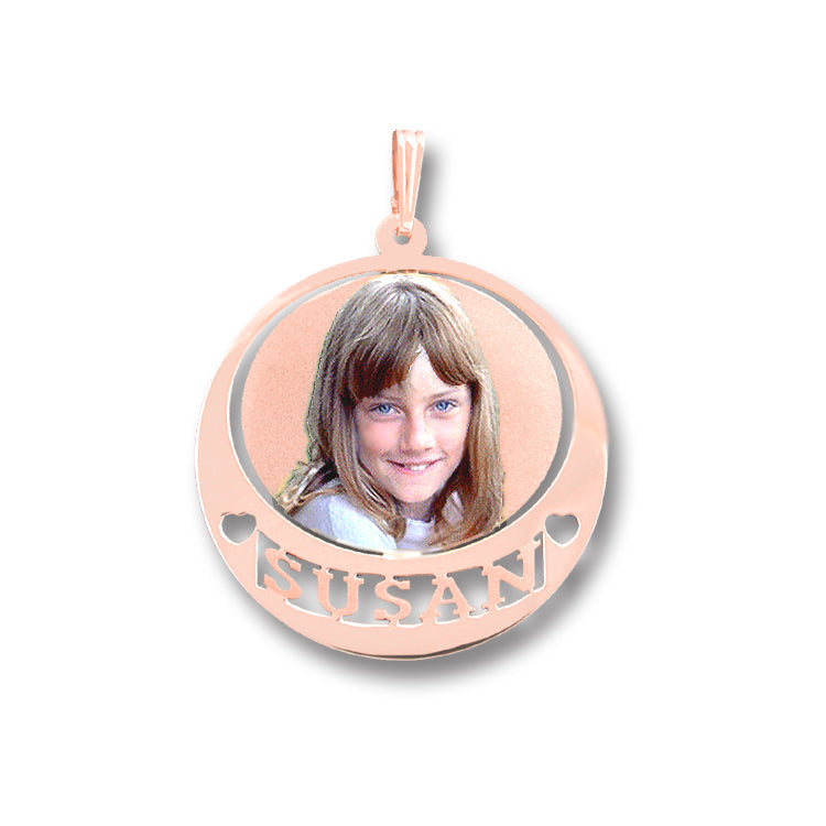 14K Gold Picture Pendant - Round Shape with Heart Punch-Out and Name Cut-Out for Personalized Photo Charm