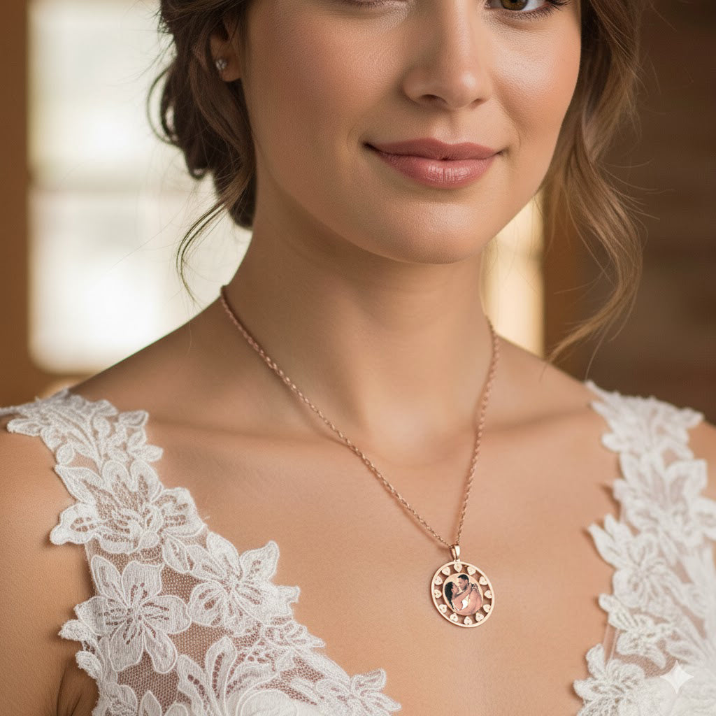 Customizable Picture Pendant - 14K Gold Circle Shape with Hearts Cut Out for Personalized Photo Charm and HD Laser Printed Custom Jewelry