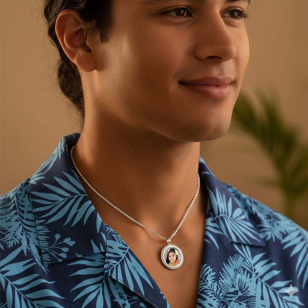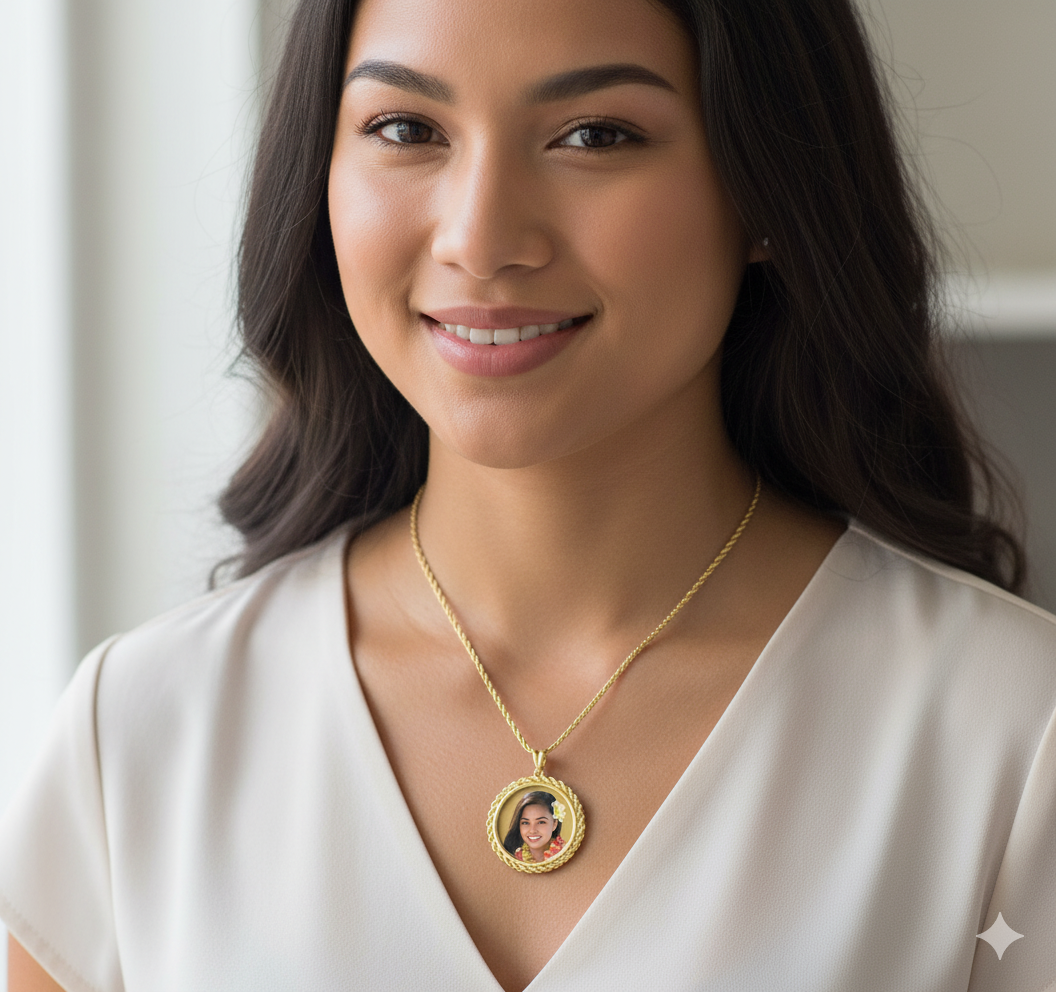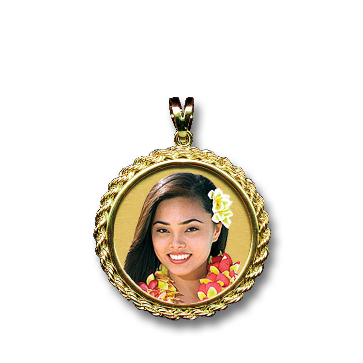 Round Shape Picture Pendant with Glass in a Rope Design Frame in Sterling Silver or Solid 14k Gold