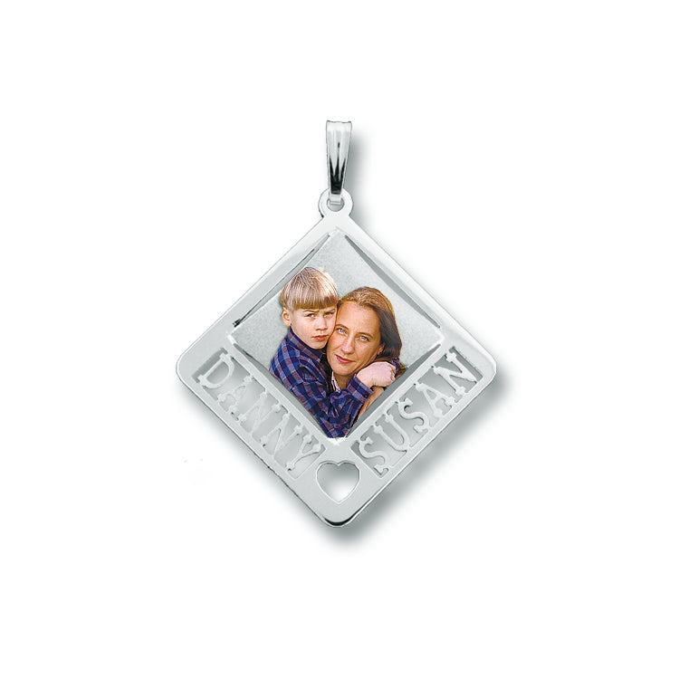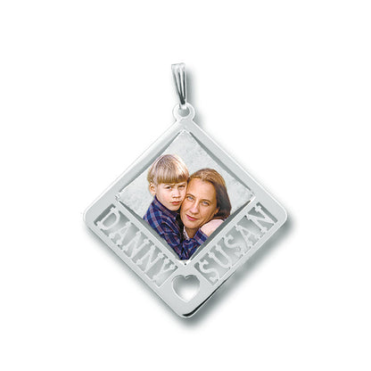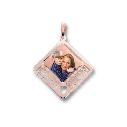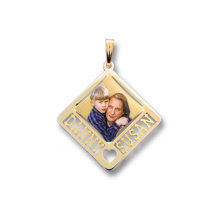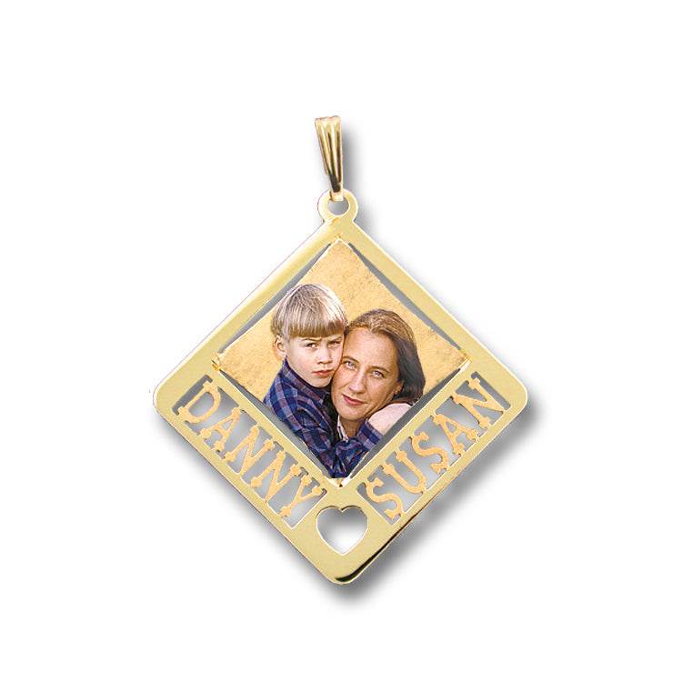 14K Gold Personalized Picture Pendant - Rectangle Shape with Heart Punch-Out and Two Names