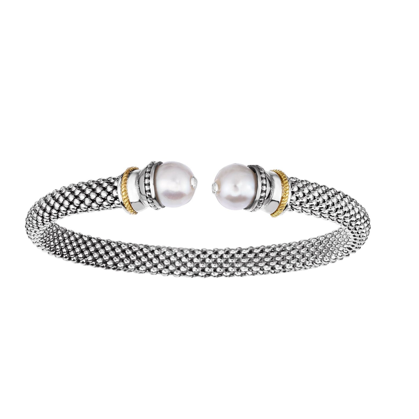 18K Goldt Yellow Gold & Sterling Silver with Domed Popcorn Cuff Bangle with Ball White Pearl Cuffs
